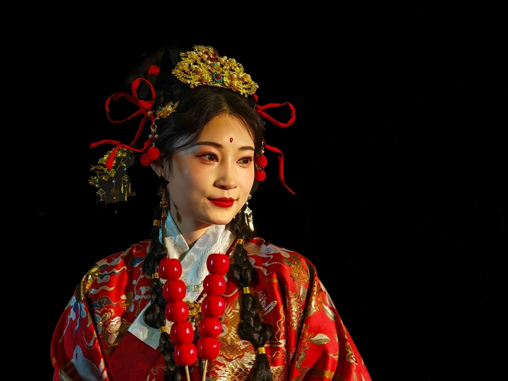 金饰如缕,红衣似火,朱颜含笑,尽显古典美人的华贵与温婉。
