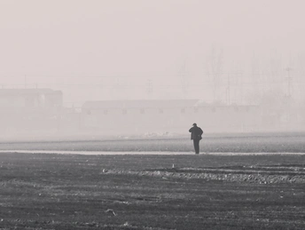 世界褪成黑白,只剩雾与路人。 脚下的路在雾里延伸,远处的轮廓模糊成线。 他在空无一人的旷野里, 把心事走成一行沉默的诗。