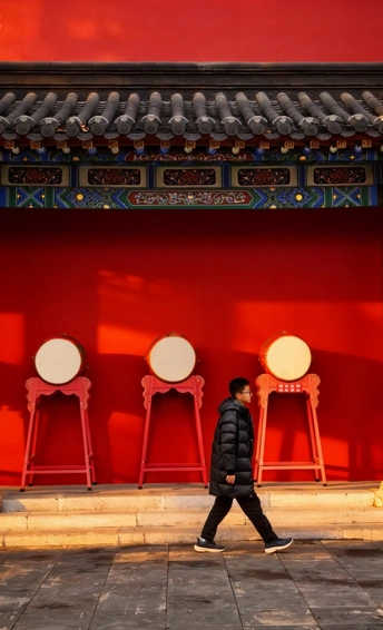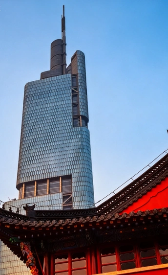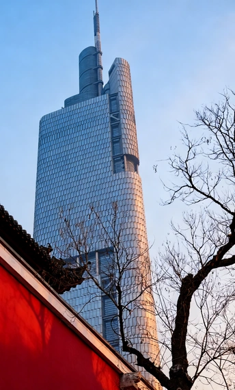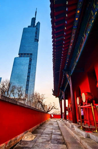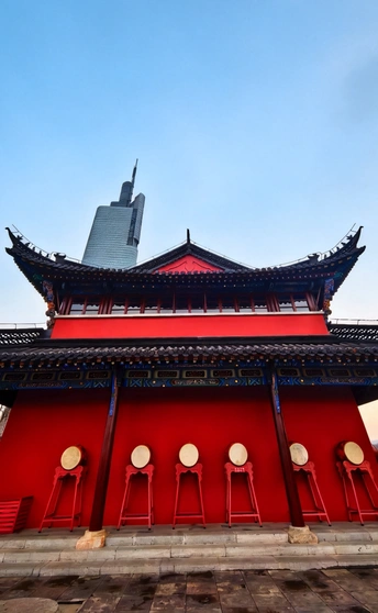 清晨的紫峰与鼓楼公园完美捕捉了古今同框”的经典画面。 鼓楼公园的红墙黛瓦,飞檐翘角的屋檐下,彩绘斗拱与朱红立柱交相辉映,几面大鼓静置于台基之上,尽显中式建筑的庄重与华美。一道朱红宫墙沿着石板路向远处延伸,将视线引向画面左侧。 高达450米的紫峰大厦如巨人般矗立,蓝色玻璃幕墙在天光下熠熠生辉,现代感十足。它与前景的古典建筑形成强烈的时空对话,传统的朱红与现代的冷蓝、飞檐的曲线与玻璃的直线,在同一画面中碰撞出独特的美感。 背景是澄澈的蓝天,几株枯树的枝桠在楼宇间勾勒出冬日的轮廓,更添几分意境,更是对历史与未来、传统与现代交融共生的生动诠释。