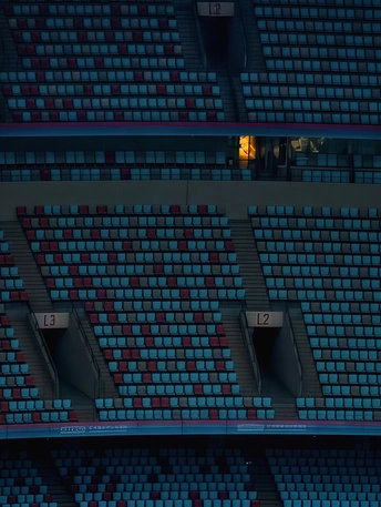 蓝红座椅如精密矩阵,在空荡的场馆里铺陈出秩序的肌理。唯有通道里那盏孤灯,刺破冷寂,成为画面的视觉锚点。对称的结构与单一的光源形成强烈对比,在无人的剧场里,定格下喧嚣落幕之后,关于等待与独白的视觉诗行。