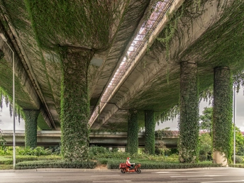 大家总说城市是钢筋水泥的森林,可硬冷的高架桥柱,早被蓬勃的爬藤裹成了绿野。垂落的枝叶如绿色瀑布,隔绝了车流喧嚣。阴天的柔光里,红衣骑行者像一道小小的闪电撞进满眼绿意,瞬间让画面活了过来。原来最好的城市风光,从来都藏在日常的缝隙里,这里是有福之州——福州。