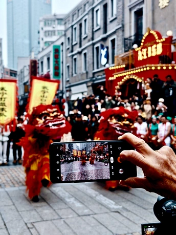 红狮在青砖路上跃, 鬃毛扫过旧楼的墙, 手机屏里框着腾挪的影, 像把年的火, 锁进 玻璃的光。 旗幡招展,人潮如浪, 新楼与老建筑对望, 这街头的舞, 是传统与当下的相拥, 每一次扑跃, 都溅起 生活里 喜的回响。