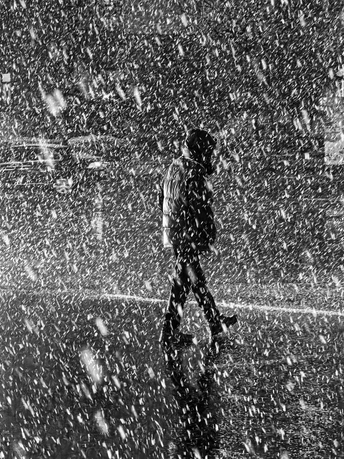 风雪如幕,行人裹紧衣衫独行,湿冷的地面映出他的轮廓,每一步都踏在漫天飞絮里,把喧嚣都隔在了身后。