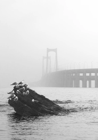 薄雾中桥影朦胧,礁石群鸥相互依偎,黑白灰中,藏着海的静谧与生机。