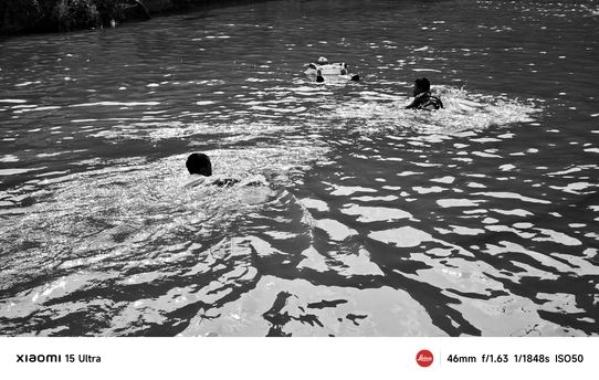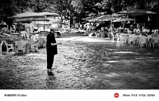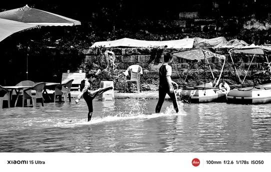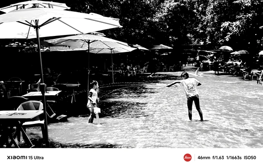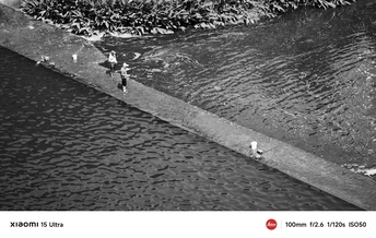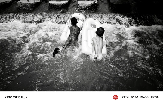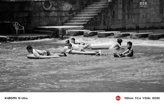 黑白光影里,喧嚣皆被沉静。孩童赤脚嬉闹,溅起晶莹的水花;大人凝神垂钓,钓起一川静谧的时光。一静一动,皆是最怀旧的光景。