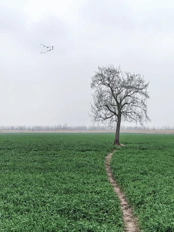 春野如碧毯铺展,孤树静立其间,一群飞鸟掠过低空,在灰蒙天色下,勾勒出一幅清寂又充满生机的乡野画卷。