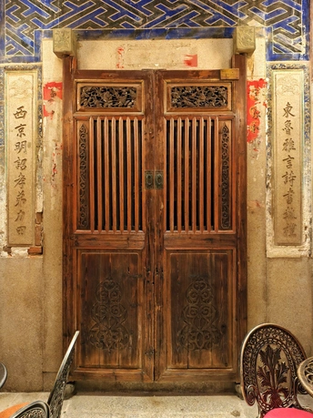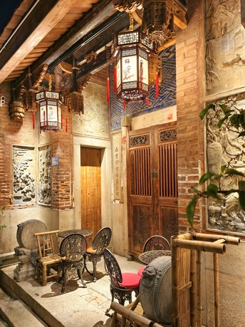 夜色漫过燕尾脊,红灯笼轻晃着旧时光。砖雕上的太平有象,门当处的兽首衔环,还有彩画里晕开的青蓝,都在暖光里慢慢苏醒。竹椅与铁艺桌静立阶前,像在等一场未完的茶话,把闽南古厝的烟火与风雅,都揉进这方寸夜色里。