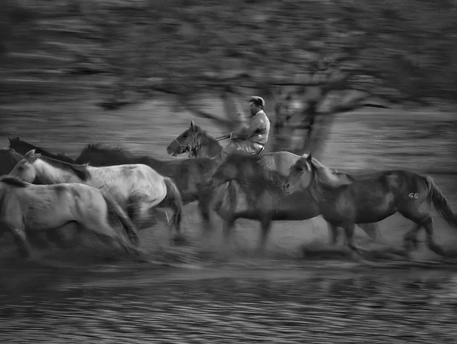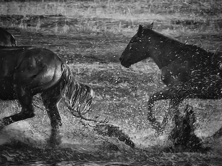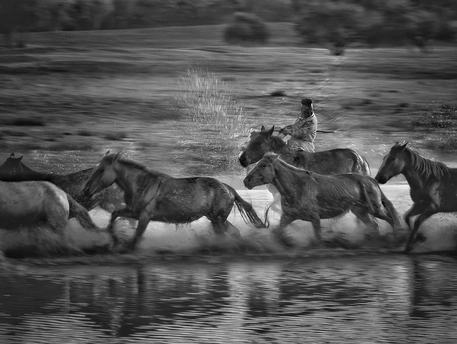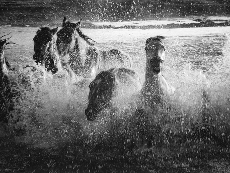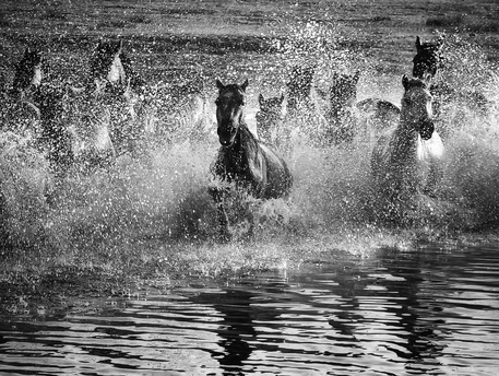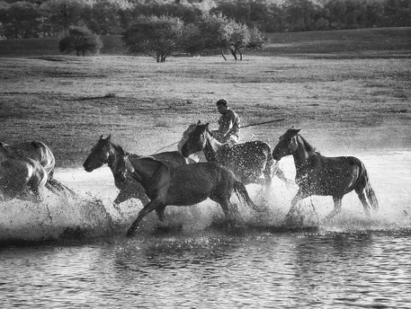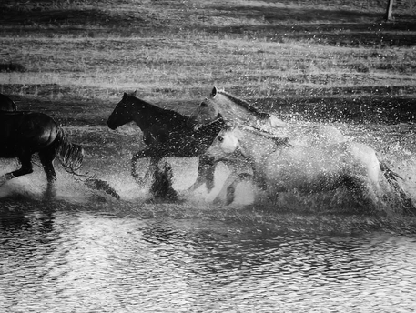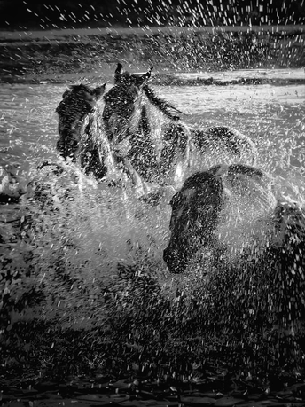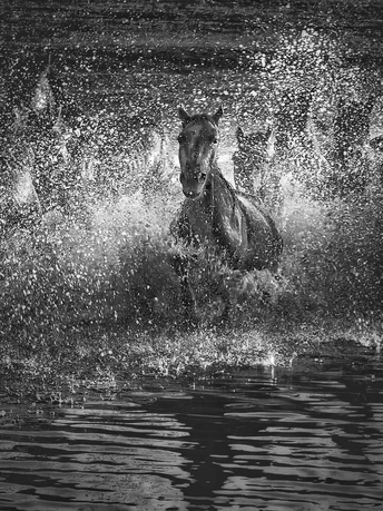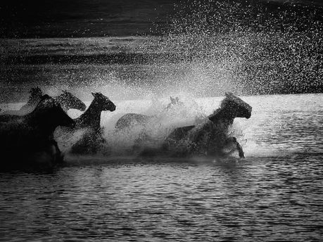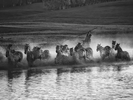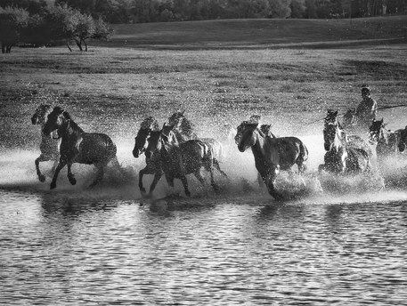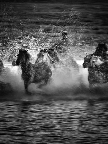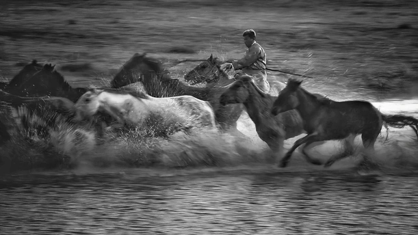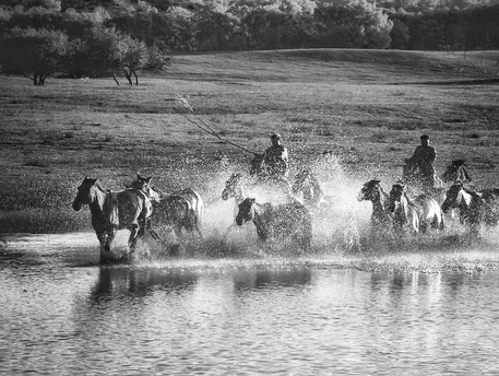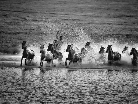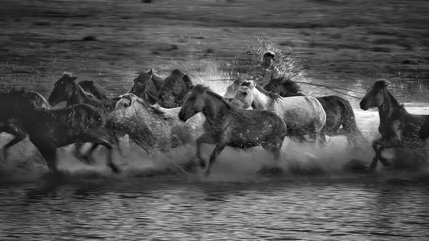 风掠过草原,马蹄踏碎晨雾,水花在黑白光影里迸溅成星。骑手的长鞭划破寂静,群马如墨色洪流,向着远方奔涌。每一次腾跃都带着野性的力量,每一声嘶鸣都撞碎在水面,又被风卷向天际。这不是逃离,是生命最本真的奔赴——向着自由,向着旷野,向着天地间未被驯服的辽阔。
