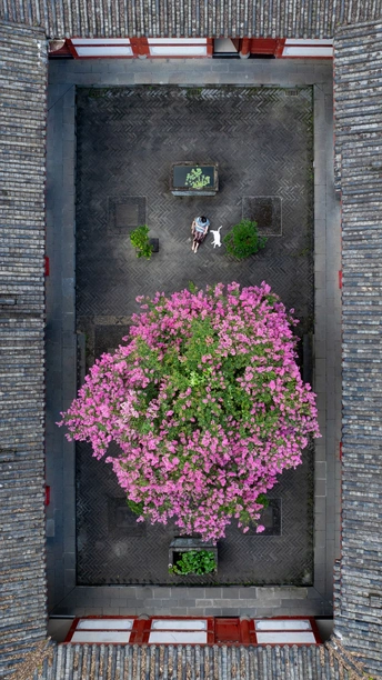 青瓦飞檐勾勒出一方天地,一人一猫静坐于花影之下。传统建筑与自然生命在此和谐对话,生活的意义不仅是奔赴远方,更是在不期而遇的美好中,与自我、与世界温柔相遇。
