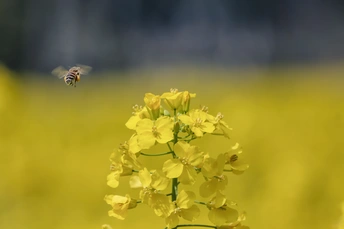 这幅作品构图采用“主体聚焦法”,油菜花居画面中心,花蕊细节清晰可辨,蜜蜂以动态虚影悬于左上方,形成“花-蜂”的视觉呼应。背景以虚化的黄色花海和深灰天空构成渐变底色,通过浅景深突出主体,蜜蜂翅膀的模糊轨迹增添画面动感,花蕊的放射状排列与蜜蜂的流线型体态形成形态对比。 色彩上以黄色为主调,油菜花的明黄与背景花海的暖黄形成层次渐变,蜜蜂的黑黄条纹与花朵色彩呼应,深灰背景则凸显主体的鲜亮。光影处理细腻,花瓣受光面呈柠檬黄,背光处泛出橙调,花蕊的阴影增强了立体感。 情感层面传递出春日的生机与喜悦,蜜蜂采蜜的瞬间定格了自然的灵动,观者能感受到生命的活力与自然的和谐。主题上通过“蜂与花”的共生关系,探讨了生态系统的依存之美,微观视角下的生命互动,隐喻着自然循环的精密与奇妙。 艺术价值在于将平凡的田园场景升华为生命礼赞,摄影师以微距手法捕捉动态瞬间,蜜蜂的虚影与花朵的实像形成时空对话。画面在极简中蕴含丰富细节,既展现了自然造物的精致,又传递出“小视角见大世界”的哲学思考,这种以微观叙事反映宏观生态的手法,赋予作品超越视觉美感的深层意涵。 以“花芯”点明主体油菜花的核心,“蜂影”捕捉蜜蜂振翅的动态虚影。