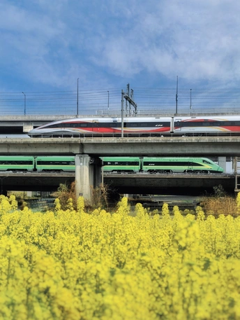 金浪翻涌,云影漫过天际。 红金与青绿的列车,在层叠的桥身之上,划破春日的澄澈。 风携着菜花的甜香,与钢铁的呼啸温柔相拥,将乡野的烂漫与时代的铿锵,都凝在这一瞬光影里。 这是春天奔赴的模样,是大地与铁轨的私语,把人间最鲜活的希望,载向更远的远方。