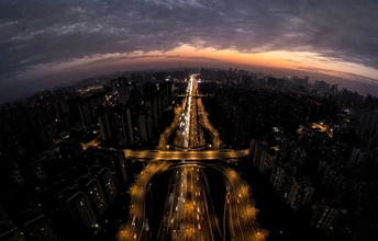 这幅作品构图采用“放射状透视法”,城市主干道自画面底部中心向远方延伸,形成强烈纵深感,环形立交桥如金色纽带连接两侧建筑群,构成“点-线-面”的立体结构。天空的弧形云层与地面的对称路网形成视觉呼应,车流灯光的线性轨迹增强了画面动感,建筑群的高低错落则打破了单调的几何秩序。 色彩上以深蓝夜空为底,橙红晚霞如丝带横亘天际,地面车流的暖黄灯光与建筑的冷蓝窗光形成冷暖对比。光影处理极具戏剧性,云层的金边与地面的灯光带构成明暗交响,立交桥的弧光在夜色中勾勒出城市的韵律感。 情感层面传递出都市的繁华与孤独,璀璨灯火下的车流似流动的星河,既展现了城市的活力,又暗含着个体的渺小。主题上通过“天-地-人”的三重维度,探讨了现代都市的空间秩序与时间流动,路网的几何美感隐喻着城市生活的规律与效率。 艺术价值在于将航拍视角与夜景美学完美融合,摄影师以宏观视野捕捉城市肌理,车流的光轨如抽象画般富有韵律,晚霞与灯光的色彩碰撞则赋予画面浪漫气息。作品超越了单纯的城市记录,成为对现代文明的视觉思考——在秩序与混乱、喧嚣与静谧的辩证中,展现了都市生命的独特律动。 天衢喻指城市主干道如天上的道路,流光精准捕捉车流灯光的轨迹