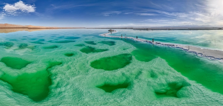 茫崖翡翠湖,是柴达木盆地的一颗明珠,盐池的肌理如叶脉般清晰,湖水的色彩如宝石般深邃,在阳光的照射下,泛着迷人的光泽。