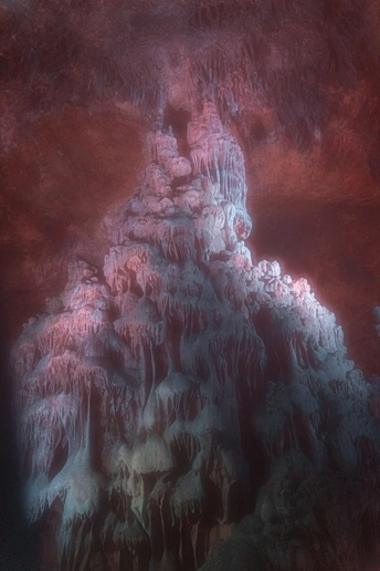亿万年溶洞在时光中静静生长,柔粉灯光漫过石脉,如坠入星际幻境,岁月与浪漫在此相拥。