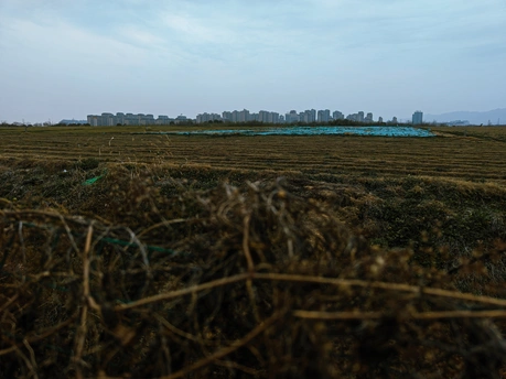 空旷田野的纹理与枯黄草色尽显自然质朴,尽头处,错落的城市建筑在朦胧天色下勾勒出发展的轮廓,自然与城市的边界在此交融,似在诉说着土地的变迁故事。