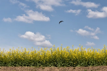 这幅作品构图采用“水平分割法”,明黄的油菜花田占据画面下半部,蔚蓝天空与白云构成上半部,形成“地-天”的明确界限。飞鸟悬于画面右上黄金分割点,翅膀舒展的姿态打破天地的平行结构,花田的水平延展与云朵的流动线条形成动静对比,地面的田埂纹理则为画面增添横向韵律。 色彩上以高饱和的明黄与湛蓝为主调,油菜花的暖黄与天空的冷蓝形成强烈互补,白色云朵作为过渡色调和视觉张力。光影处理自然通透,花田受光面呈柠檬黄,背光处泛出橄榄绿,天空的蓝色随云层厚薄呈现深浅变化。 情感层面传递出自由与生机,无垠的花田象征希望,飞鸟则隐喻挣脱束缚的向往,观者能感受到自然的开阔与心灵的释放。主题上通过“大地-天空-生命”的三重意象,探讨了自然的壮美与生命的自由,花田的繁茂与飞鸟的孤绝形成个体与群体的哲学对话。 艺术价值在于将平凡田园升华为诗意象征,摄影师以极简构图捕捉自然之美,飞鸟的单点与花田的面状铺陈形成“点面结合”的视觉节奏。画面在写实中蕴含象征,既展现了春日田园的视觉盛宴,又传递出对自由生命的礼赞,这种“以景喻情”的手法赋予作品超越景观记录的精神内涵。 “孤羽”聚焦画面唯一飞鸟,突出其独立姿态;“栖春”点明季节。