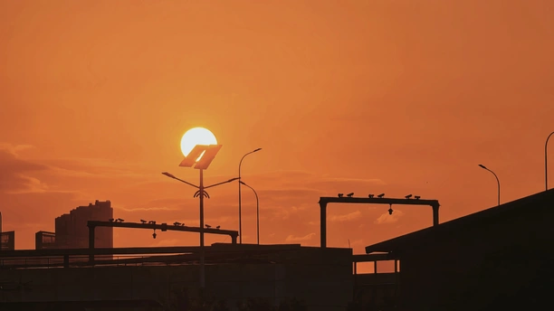当太阳落到太阳能电池板上,太阳的能量仿佛实化了。错位的瞬间,建构了一个能量传输的可以肉眼看见的通道。剪影之中,林立的摄像头就像一个个见证者,它们眼里拍摄的看见的是什么呢,我想应该远不止是匆匆来往的车流,还有一份夕阳下的从容与坚守。