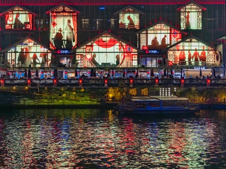 成都东门码墙面光影与水波倒影交相辉映。