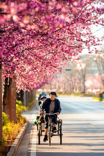 丽江樱花大道上,每天早晨都能遇到这对老人。老爷爷骑着三轮车,载着老伴儿,去他们的小菜地浇水施肥。
