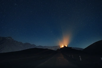 夜赴群山,见漫天星辰。 在斯特潘茨明达, 圣三一大教堂矗立在世界的边缘, 一束暖光,刺破黑暗, 守护着这片土地最纯粹的虔诚。