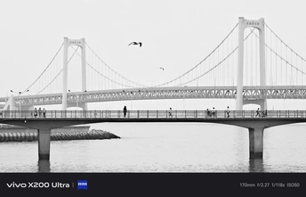 踩着海风走了两小时,消波块的棱角、跨海大桥的钢索、缆车的轮廓,都在黑白里变得温柔又锋利。海鸥掠过海面,摩天轮在远处转着,每一步都踩在城市与海的交界线里。