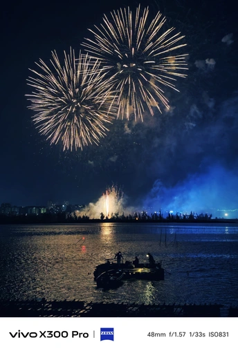 蓝调入夜,烟花绽空,江面渔火与烟火相映,节日让劳作满溢美好奔头。