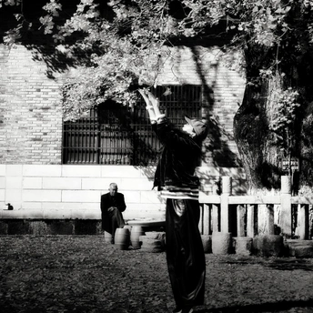 前景拍照的人与远景旁观的大爷形成了看与被看的关系。