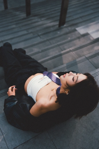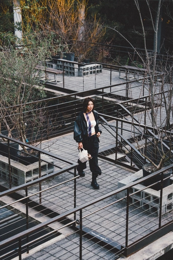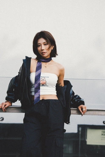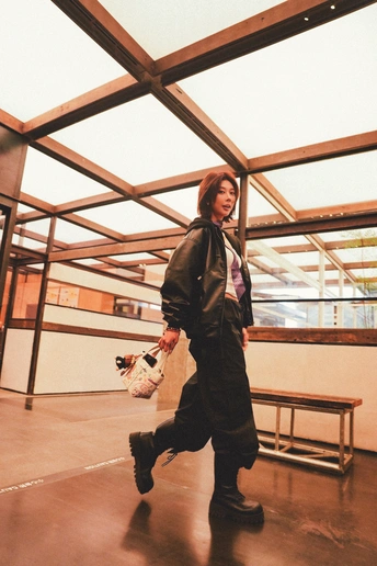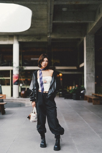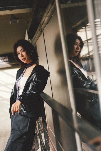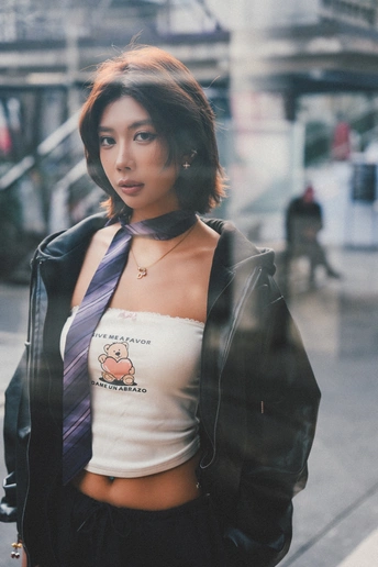 把领带系成叛逆的形状, 皮衣裹住半熟的锋芒。 在工业风的街巷里穿梭, 每一步都踩在自由的节拍上。 阳光穿过玻璃与铁锈, 在发梢镀上暖光, 眼神里藏着不被驯服的野。 酷飒与甜感碰撞, 是属于都市女孩的随性张力。