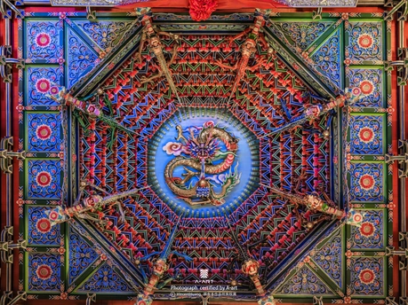 宁德大圣宫藻井如一方璀璨的天穹悬于殿顶。金龙盘踞中央,口衔明珠,四周斗拱层叠如莲花绽放,红蓝绿彩绘交织出繁复的几何纹样。这方"通天"的木构苍穹,既是闽东匠人的巧思结晶,也是连接天地的信仰之眼,在光影流转间诉说着百年匠心与虔诚。