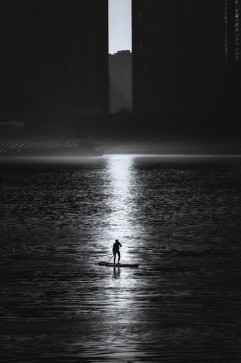 江雾漫卷,楼宇如磐,落日熔金,江波漾影。一人一桨划破城市的寂静,于喧嚣缝隙寻一隅澄澈,以孤舟之姿赴一场与光影的约会。黑白之间,是都市与自然的对望,亦是内心的从容独行,独守一份宁静与诗意。