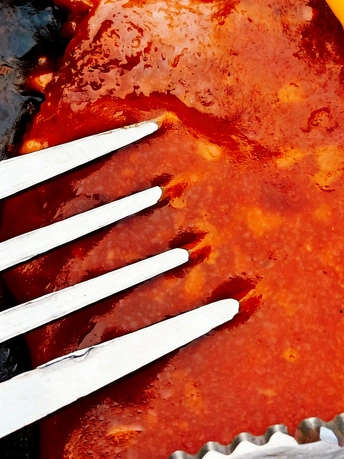 画面以浓郁的红酱为绝对主角,粘稠的质感在光影下泛着诱人的油光,金属刀叉的冷冽光泽与之形成强烈的材质对冲。我们刻意弱化了背景干扰,利用大光圈营造出梦幻的浅景深,让每一滴酱汁的流动、每一道刀痕的纹理都成为视觉焦点,精准还原了“食欲级”的视觉冲击。 暖调的红与冷调的银交织,不仅是色彩的碰撞,更是烟火气与生活质感的对话。这不仅是对美食的记录,更是对“吃”这一行为的仪式感致敬。在米拍的镜头里,拒绝千篇一律的摆拍,唯有真实的细节与饱满的情绪,才能打动人心