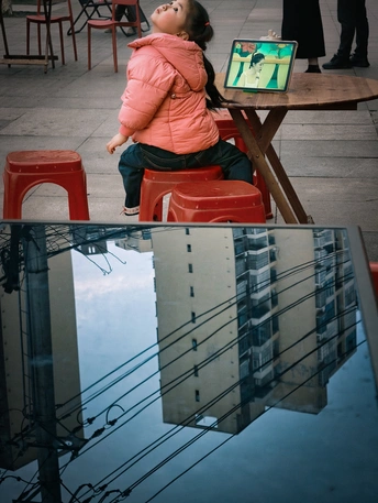 《屏幕外的天地》 屏幕里有剧,屏幕外有天。 玻璃映着城,眼里装着光。 小孩的向往,从来不在方寸之间。照片以镜面倒影与仰望姿态的视觉对比,探讨数字时代虚拟与现实的边界,传递出“真正的天地在屏幕之外”的核心思考,用日常街头的微小瞬间,唤起人们对真实生活与自由向往的珍视。
