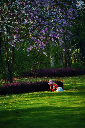 这是一张环卫工人在除草时拍摄的作品。阳光打在春天盛开的紫荆花树上,草坪上落了一些花瓣和干叶,环卫工人一边除草一边把干支和杂草装入袋子里,平凡人的世界也有光彩和花香。