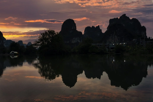 构图:采用对称式构图,水面倒影与实景完美呼应,将山峰、天空的景致在水面复刻,形成上下对称的镜像美感。前景的水面、中景的峰林与远景的天空层次分明,既凸显了喀斯特地貌的奇特,又让画面在开阔中不失平衡,尽显山水交融的诗意。 色彩:以暖橙与深紫为主色调,天空的橙红霞光与峰林的深黑剪影形成强烈对比,为画面添了几分浪漫与大气。水面倒影复刻了天空的色彩层次,低饱和的色调精准烘托出暮色时分的朦胧与沉静,氛围感拉满。 情感:画面传递出极致的宁静与治愈感。暮色下的山水仿佛将时间都慢了下来,让人在欣赏中忘却喧嚣。朦胧的霞光与静谧的水面,唤起内心深处对自然的亲近感,于山水间找到心灵的归处,获得久违的平静。 主题:以“暮色山水的诗意交融”为主题,通过喀斯特峰林与暮色天空的同框,展现了自然山水的独特魅力。水面倒影为这份自然之美添了几分灵动,传递出对自然平衡之美的赞颂,让人在山水中读懂诗意与从容。 艺术价值:将日常的山水风景升华为富有诗意的艺术作品,用对称构图与色彩对比定格了暮色的瞬间。它以静谧的视觉语言,引发观者对自然之美的共鸣,兼具审美价值与精神疗愈作用,为山水摄影提供了兼具意境与美感的范本。