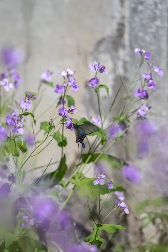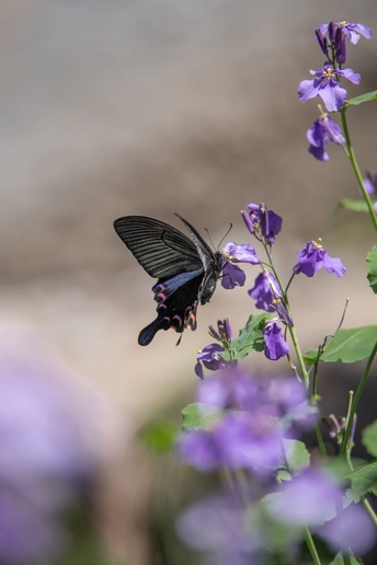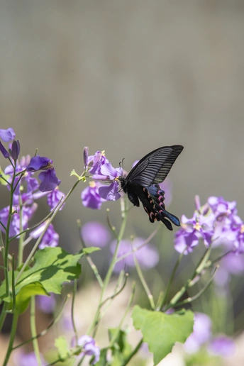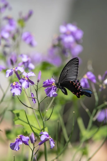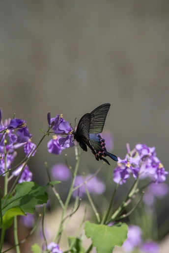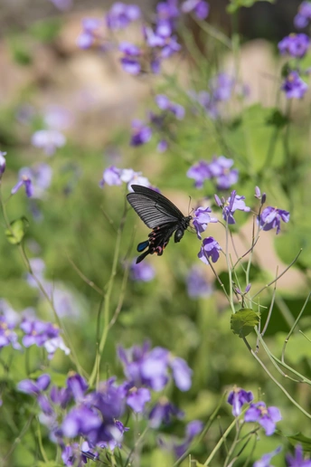 春天,在二月兰的花丛里发现一只碧凤蝶,它的翅膀在春光的照耀下闪着五彩斑斓的金属光泽。