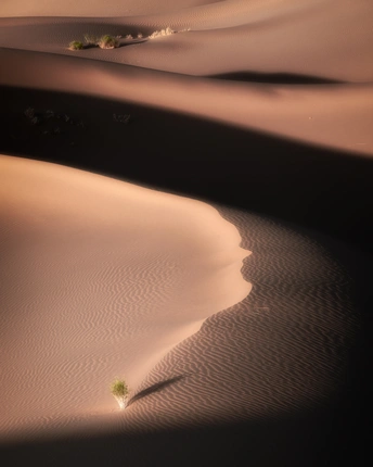 夏日的巴丹吉林,光线温暖而低沉,荒漠深处一株小树吸引了我。#巴丹吉林沙漠 #沙漠摄影 #明暗对比 #沙丘曲线 #极简构图 #荒漠植物 #光影艺术 #自然风光