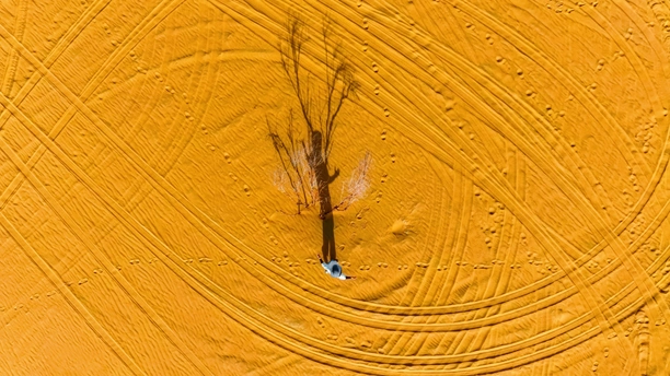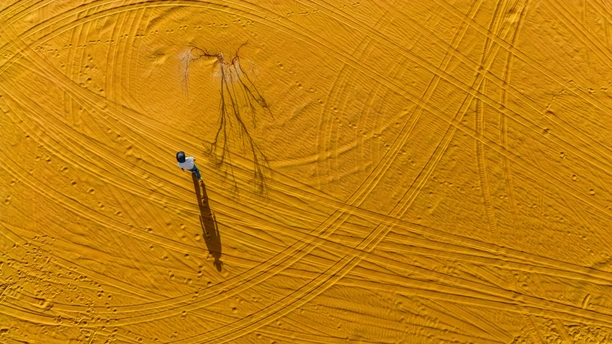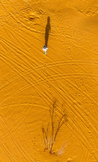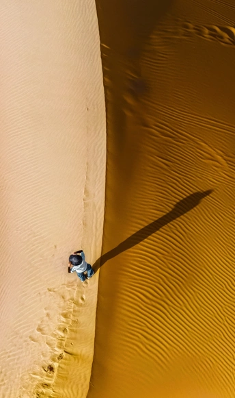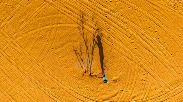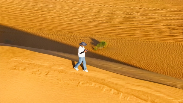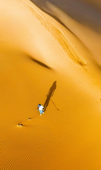 风停了,沙丘的影子却还在奔跑。 我按下快门,把流动的金色凝固成永恒。光线斜斜地铺开,像时间在沙面上缓缓摊平自己。远处的车辙停在半坡,仿佛刚才那阵风还在犹豫——该把这片沙漠吹向哪里。 而我只是站着,让影子与沙影重叠。此刻腾格里安静得像一个被定格的梦,所有的辽阔都收进方寸之间。原来天地大美,总在风止之后,才肯露出真容。