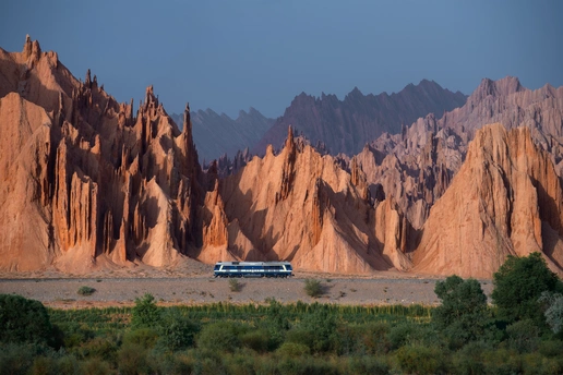 这是独库公路旁最震撼的 “次元裂缝”:库车红山石林以刀削斧凿的姿态矗立,嶙峋的峰林直指苍穹,像《指环王》里的末日火山被搬移到了天山脚下。一列蓝白相间的内燃机车正从谷底驶过,在这片仿佛不属于地球的赤红荒野里,它成了唯一流动的线条。前方的绿洲、身后的荒漠、头顶的灰蓝天空,共同构成了一幅魔幻又写实的画卷,把 “现实版中土世界” 的氛围感拉满。