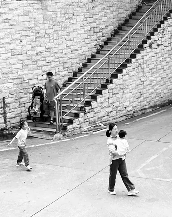 在黑白光影里,小女孩欢快奔跑,女子怀抱孩童漫步,男子推婴儿车伫立台阶,这平凡瞬间满是生活温情。