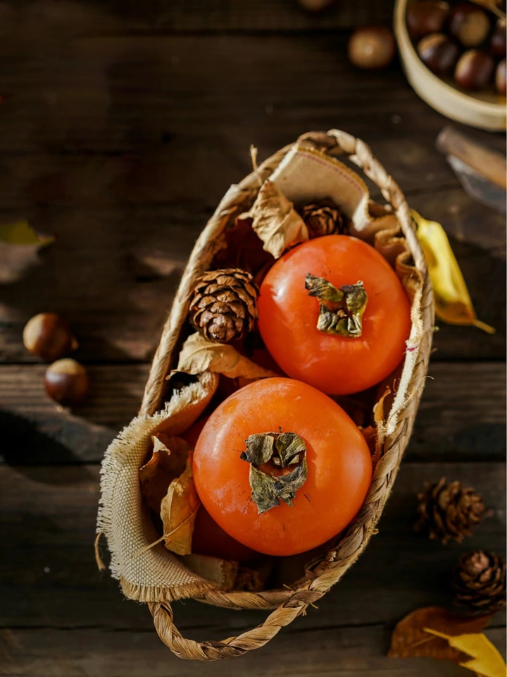 木质桌面上,一个浅棕色编织篮内盛放着两枚橙红色柿子,顶部带着干枯的蒂部。篮子周围散落着黄褐色枯叶、棕色松果和板栗,右上角有一小碗栗子。整体画面呈现出温暖的秋日氛围,光影柔和,色调以棕、橙为主,充满自然质朴的质感。