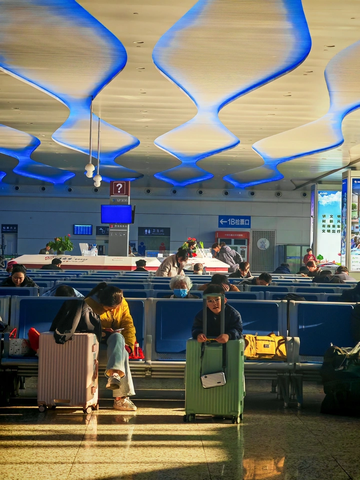 现代化的候车大厅天花板采用了独特的波浪形设计,点缀着蓝色的灯带,灯光柔和地洒下,营造出一种宁静而科技感的氛围。大厅内,淘气的小男孩玩弄着行李箱。光影交错,增添了画面的层次感。