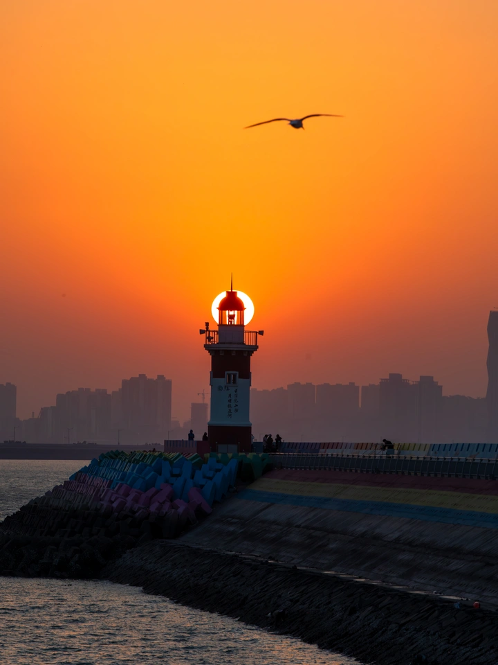 这幅图定格了日落时分海边灯塔的绝美瞬间:暖橙色的天幕从浅橙晕染至深绯,一轮圆日恰好嵌在灯塔的红顶塔尖后方,给塔身镀上了一层朦胧的金边。一只海鸥正展翅掠过天空,动态的飞影与静谧的塔、城、海形成了柔和的反差,背景里的城市建筑群在暖光中晕成浅淡的轮廓,让这份海滨的浪漫又多了些烟火质感。