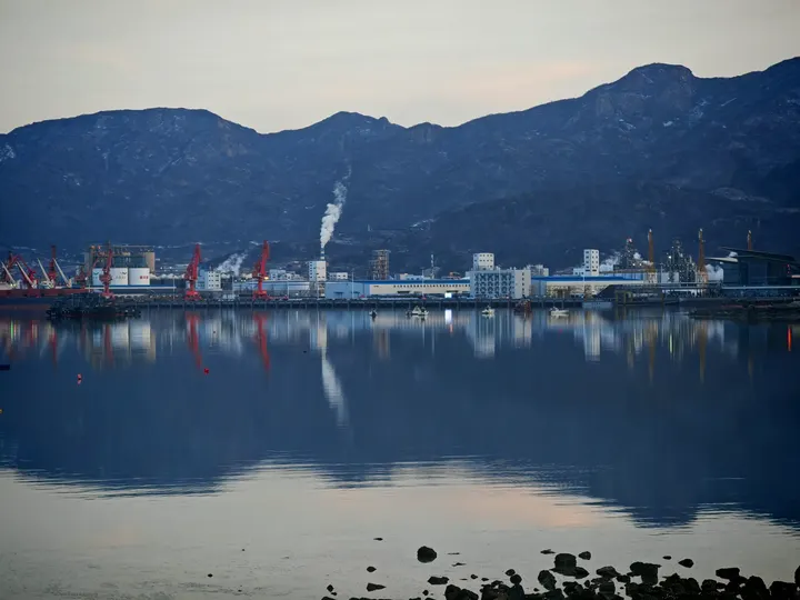 暮色漫过山海,港口的喧嚣渐渐沉了下来。水面像一块温润的镜子,把吊臂的红、厂房的白,还有远山的黛色都轻轻收了进去。远处烟囱里的白烟缓缓舒展,和天边的云融在一起。这一刻,工业的硬朗和山海的温柔,都在这片静水里,酿成了独属于黄昏的浪漫。