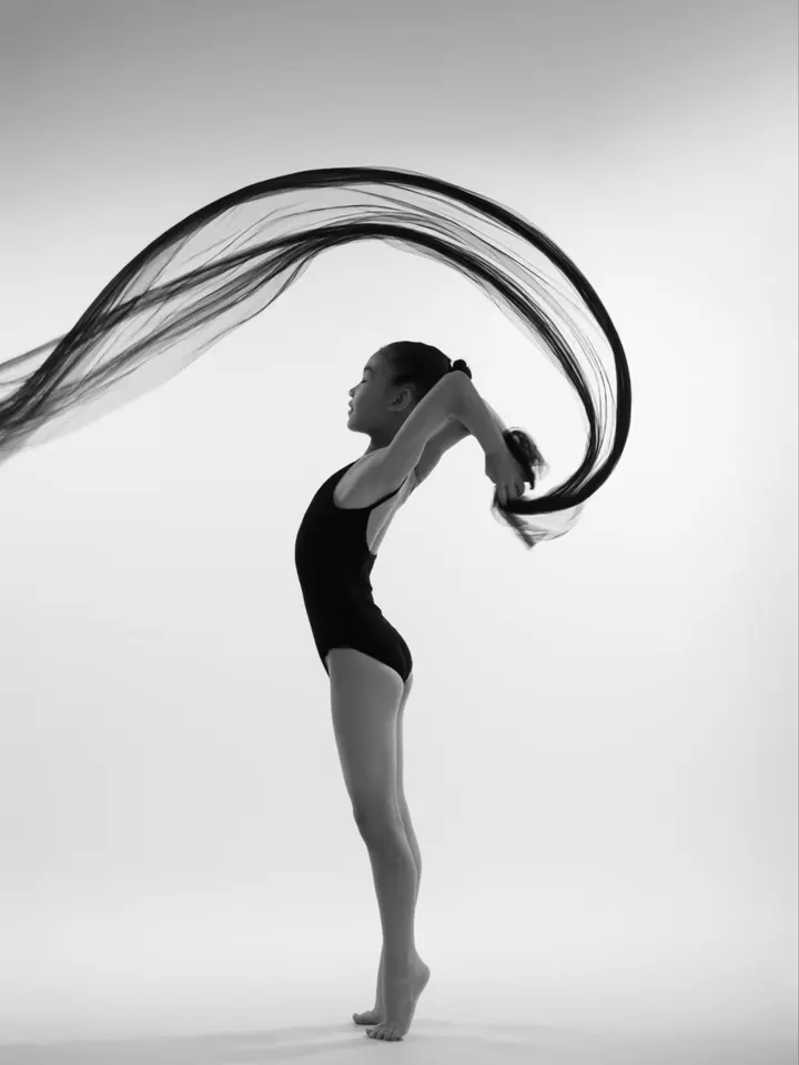 在黑白的世界里,身体是笔,绸带是墨。 每一次舒展,都是线条的流动;每一个弧度,都是力与美的共生。 当绸带在空中划出完整的弧,时间也为这一瞬静止。 这是独属于舞者的浪漫,在动静之间,把身体跳成一首诗。