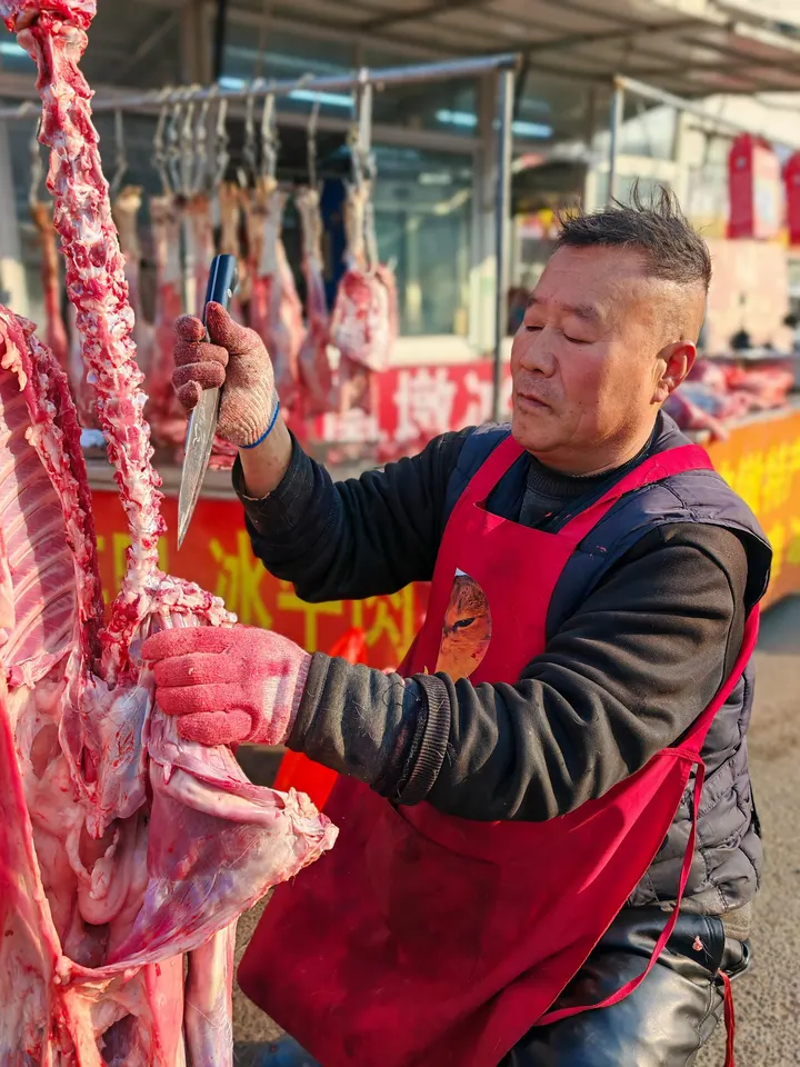 集市的晨光里,他是平凡的庖丁。红围裙沾着细碎的肉屑,手中的刀在骨与肉间游走,动作利落而笃定。三十年的烟火气里,刀锋早已磨得发亮,每一次落刀都精准稳当,这是属于市井里的生巧,也是藏在集市一角的生活底气。