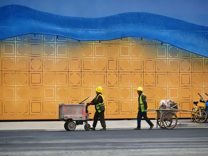 他们戴着黄色安全帽,脚步踏在还带着沥青温度的路面上。 推车的轮子碾过斑马线,发出规律的轻响,和城市苏醒的节奏悄然呼应。 没有惊天动地的口号,只有日复一日的奔赴。 在蓝与金的色块之间,这些平凡的脚步,正一步步铺就着城市的新模样。