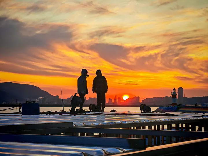当落日把天空烧熔成一片橙金,码头的金属平台上,两个身影依然挺立。 他们是城市建设的无名脊梁,在熔金般的暮色里,与海风、焊光相伴。 脚下是微凉的钢板,身后是奔涌的云霞,平凡的身影,在橙光里凝成了最动人的剪影。