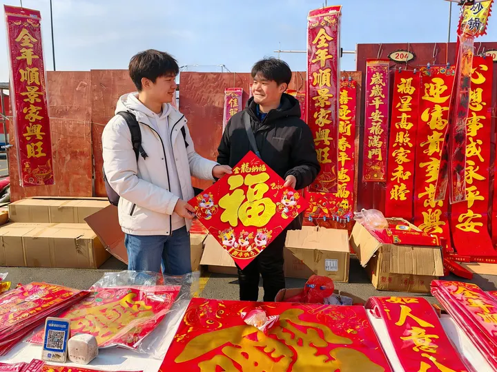 镜头定格在年集的一角,红底金字的春联铺满视野。年轻人指尖触碰福字的瞬间,是传统与青春的碰撞。把福气带回家,不仅是动作,更是中国人刻在骨子里的浪漫。