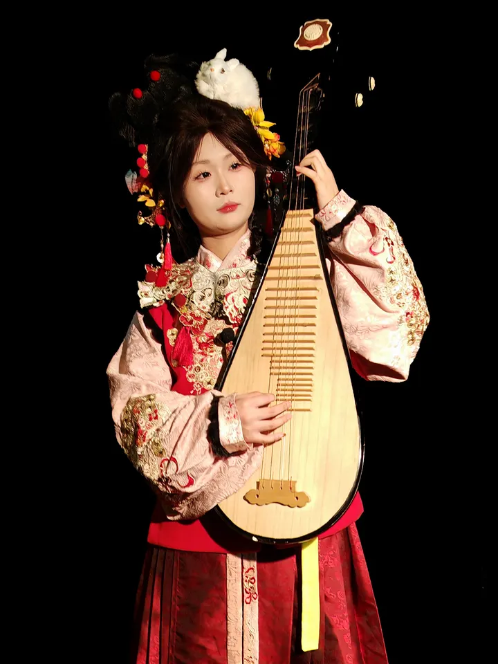 拍摄时特意压暗背景,只为突出指尖与琴弦的互动。汉服的刺绣、头饰的绒兔、拨弦的指尖,共同构成了这幅《指尖上的国风》。用镜头记录传统之美,让每一份细腻都被看见。