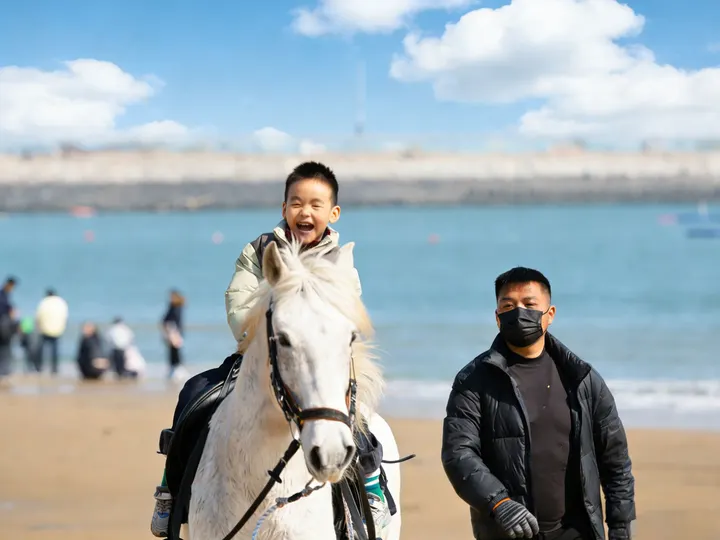 海风拂过鬃毛,笑声漫过沙滩。少年骑在白马上,眼里是藏不住的欢喜,身旁是稳稳的守护。